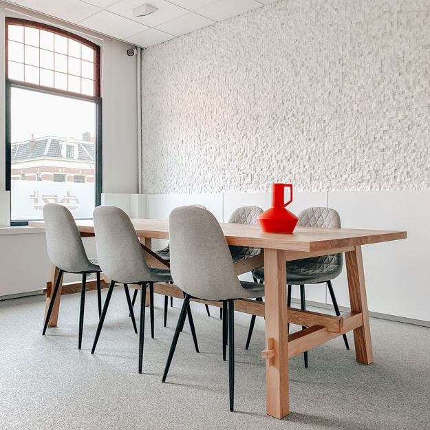 Voor zakelijke opdrachtgevers heb ik een aparte ruimte ingericht als representatieve 'directiekamer' met luxe draaifauteuils, waar in alle rust gesprekken kunnen plaatsvinden. Verder naar achteren in het pand heb ik een multifunctionele kantoorruimte ontworpen met een lange tafel voor vergaderingen én gezamenlijke lunches, plus een werkplek voor de manager.